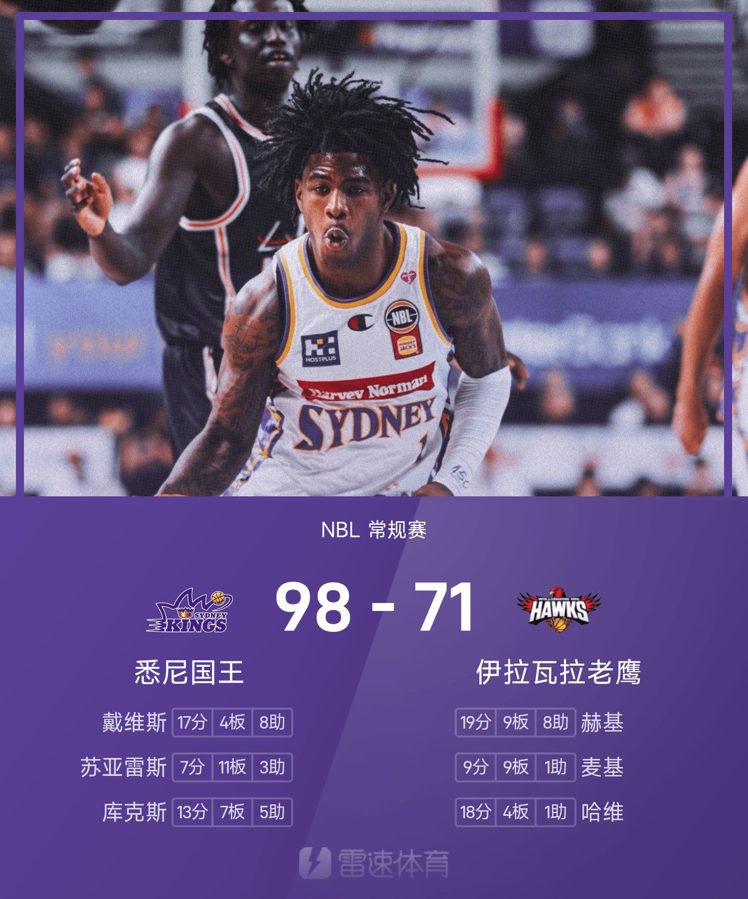 NBL战报:戴维斯17分8助,悉尼国王98-71大胜伊拉瓦拉老鹰