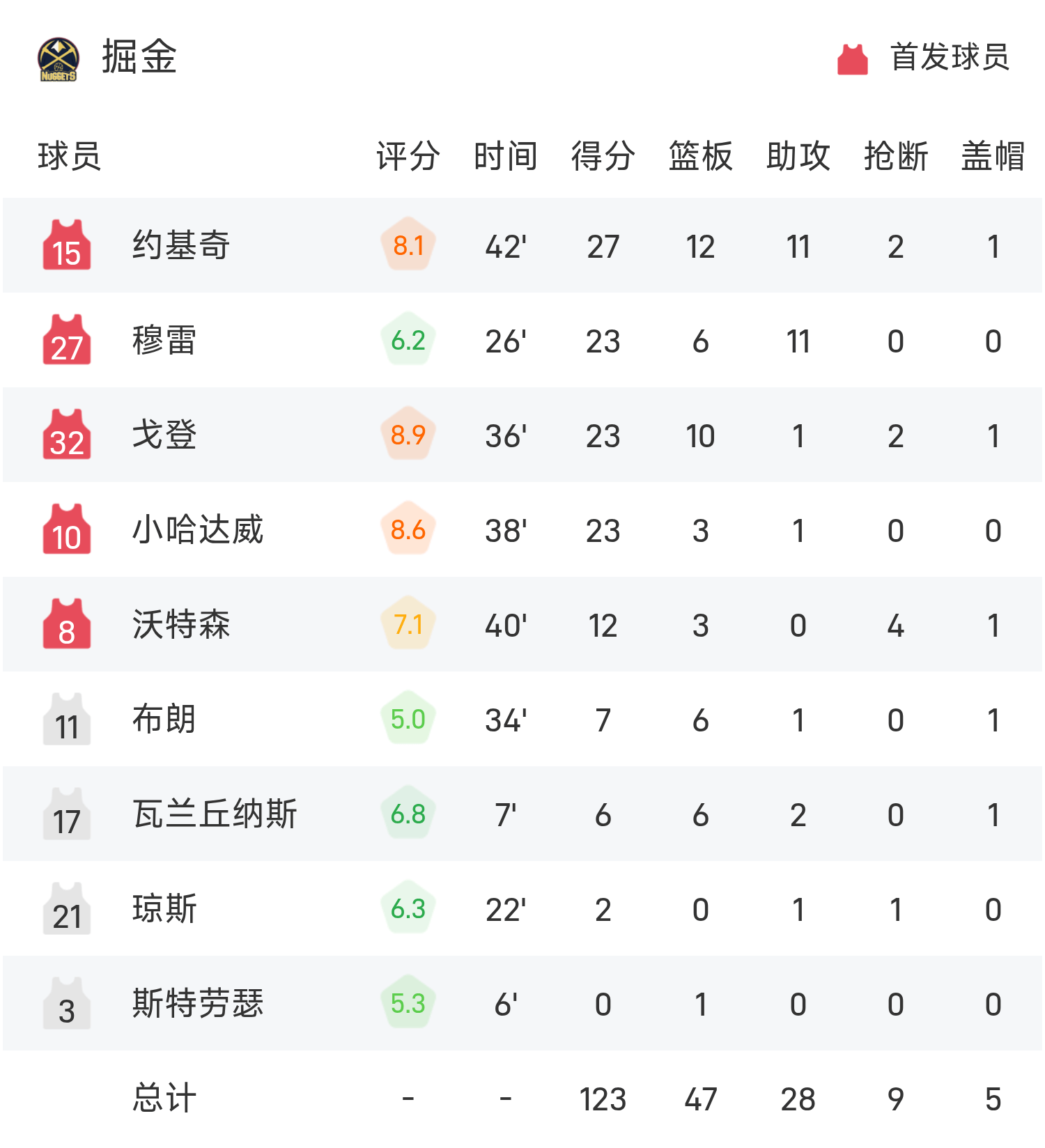 NBA战报:约基奇27分12板11助,掘金123-112击败森林狼