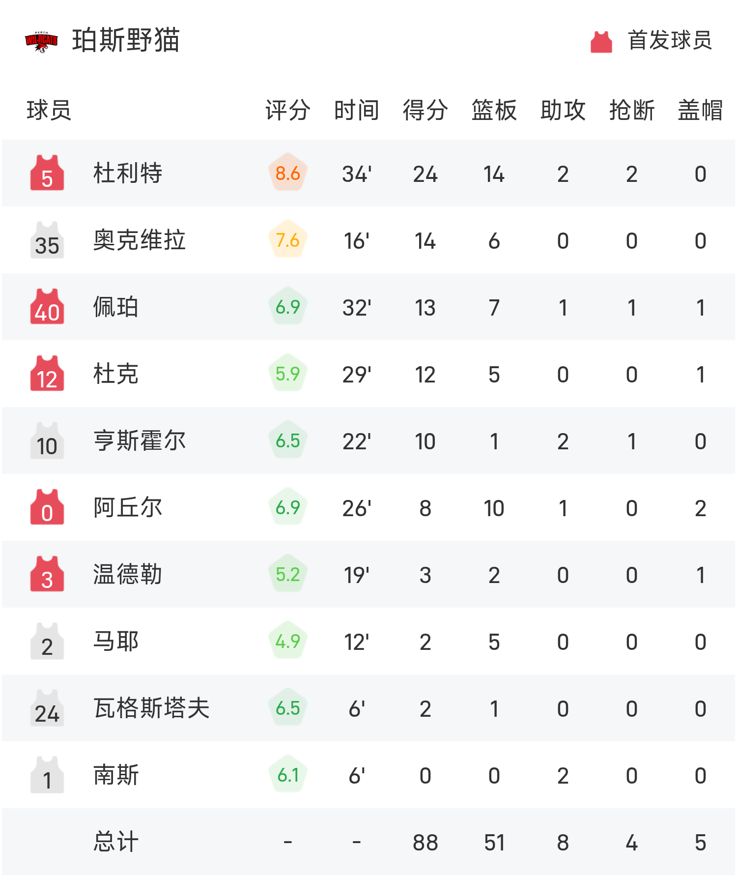 6686体育官网11月15日讯 25/26赛季NBL 常规赛,珀斯野猫对阵新西兰毁坏者。双方全场战罢,珀斯野猫88-75战胜新西兰毁坏者。杜利特砍下全场最高的24分14板2助,率领珀斯野猫胜利取胜。