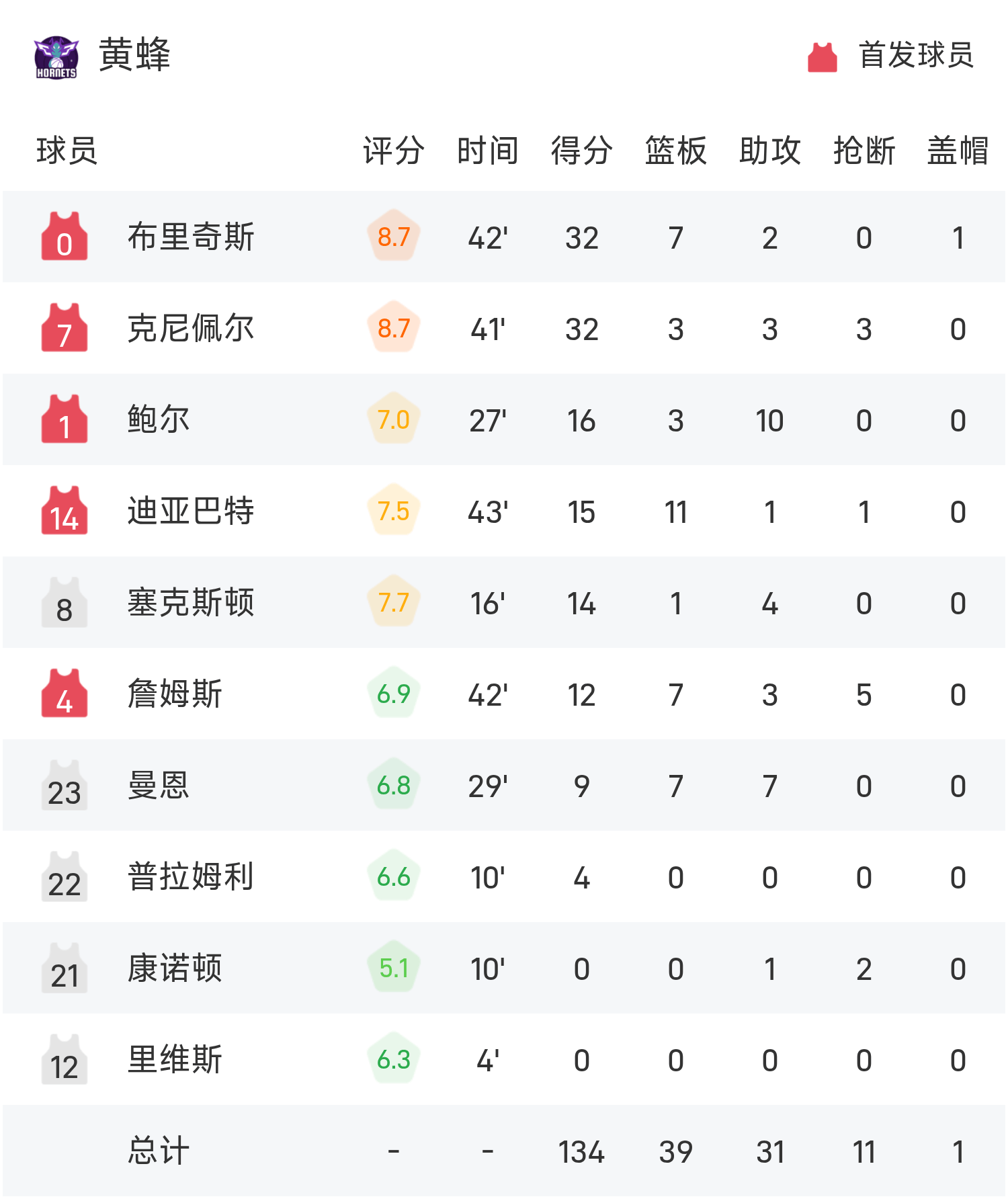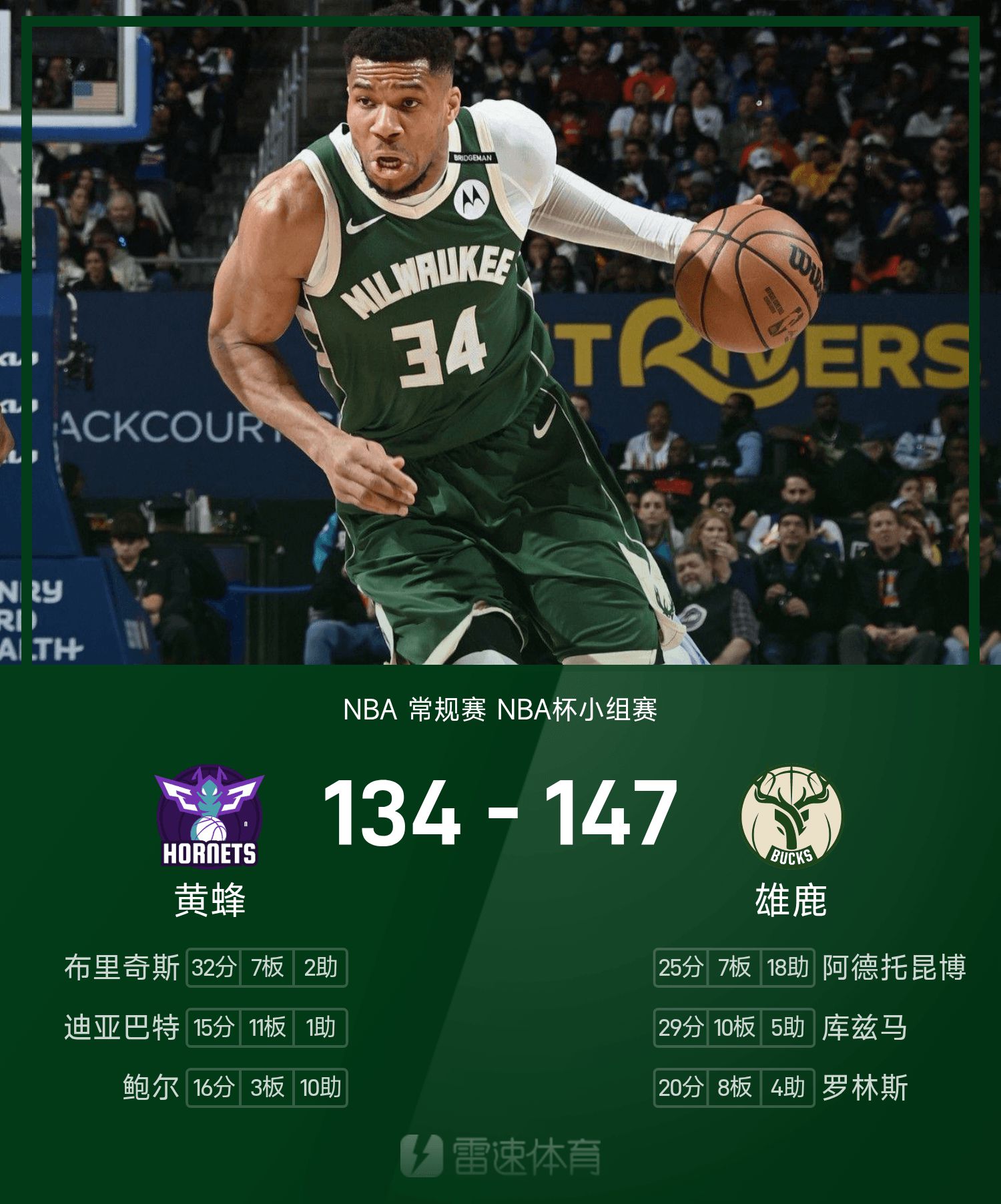 6686体育官网11月15日讯 25/26赛季NBA 常规赛 NBA杯分组赛,雄鹿对阵黄蜂。双方全场战罢,雄鹿147-134战胜黄蜂。库兹马得到29分10板5助率队取胜,布里奇斯空砍全场最高的32分7板2助。