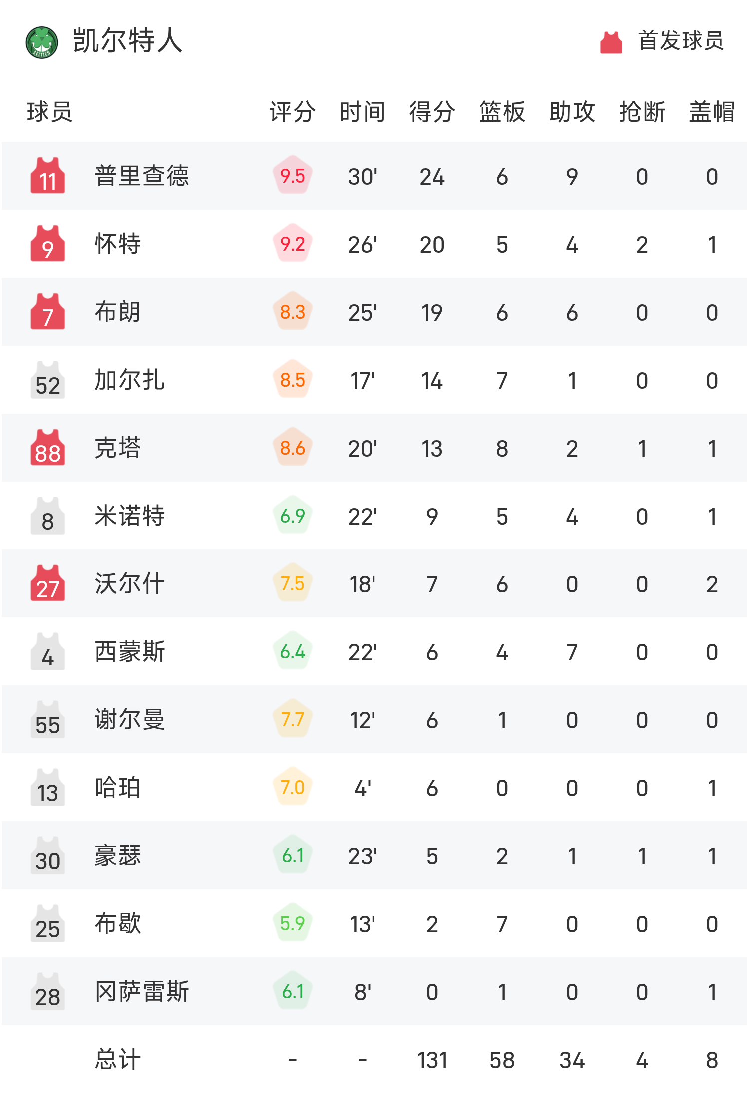 普里查德砍下全场最高的24分6板9助,率领凯尔特人胜利取胜。