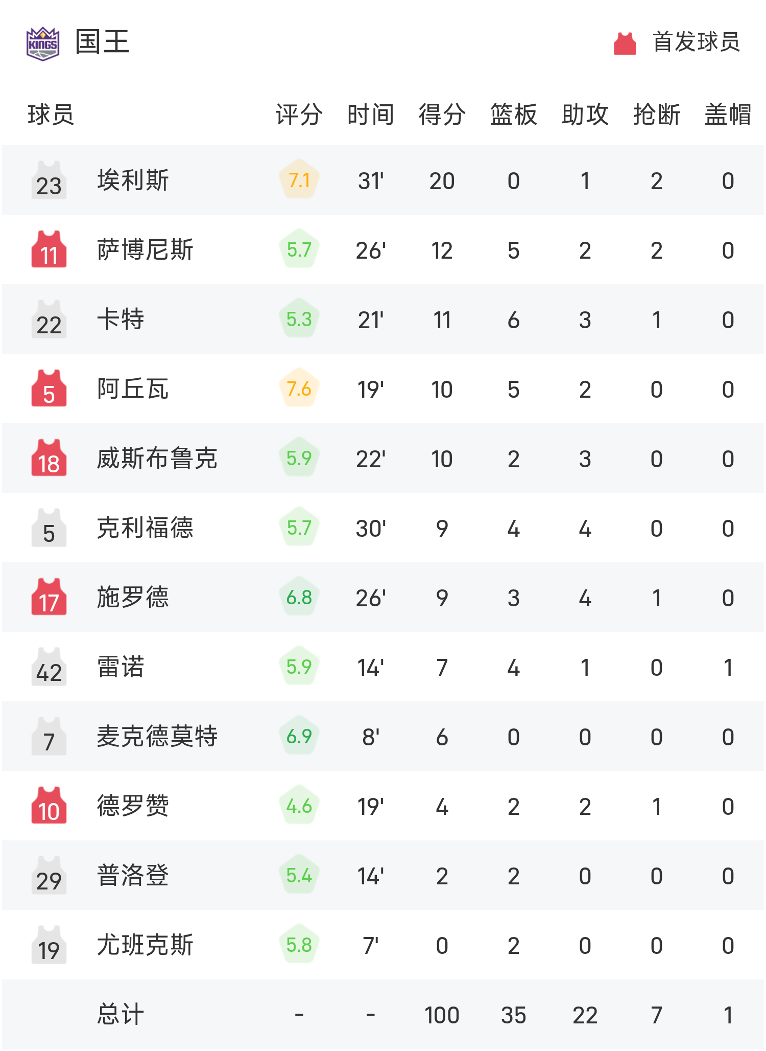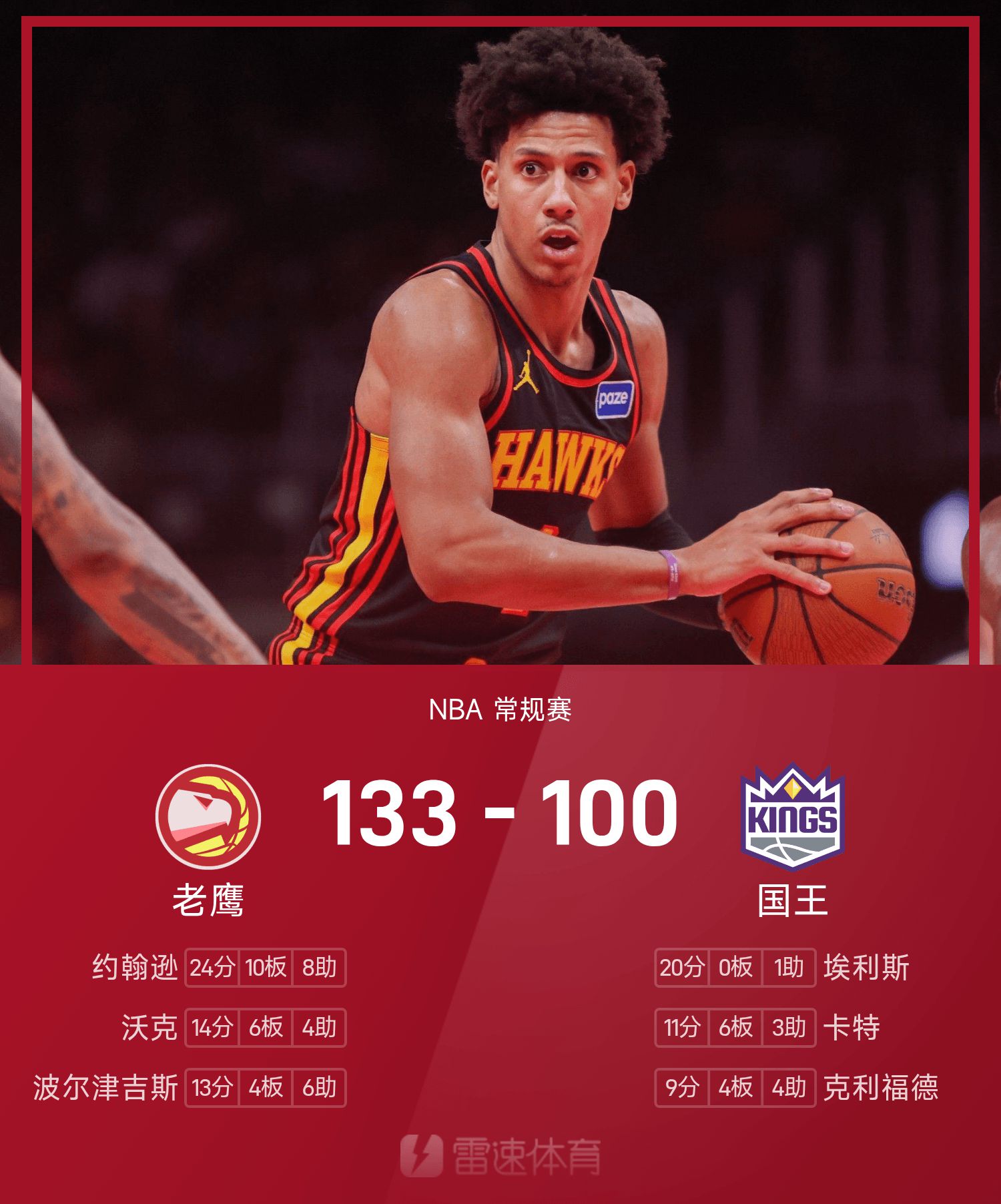 6686体育官网11月13日讯 25/26赛季NBA 常规赛,国王对阵老鹰。双方全场战罢,国王100-133不敌老鹰。约翰逊砍下全场最高的24分10板8助,率领老鹰胜利取胜。