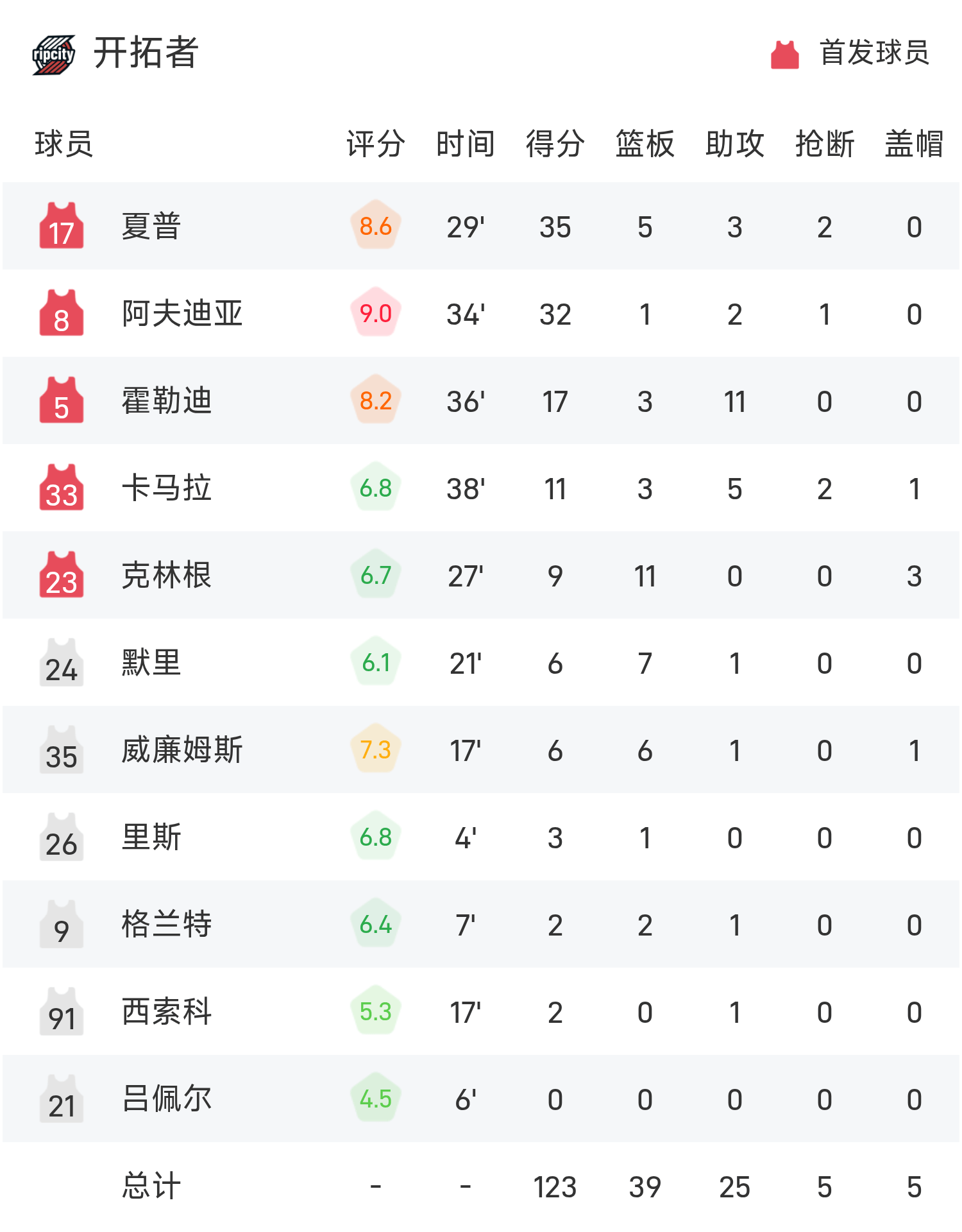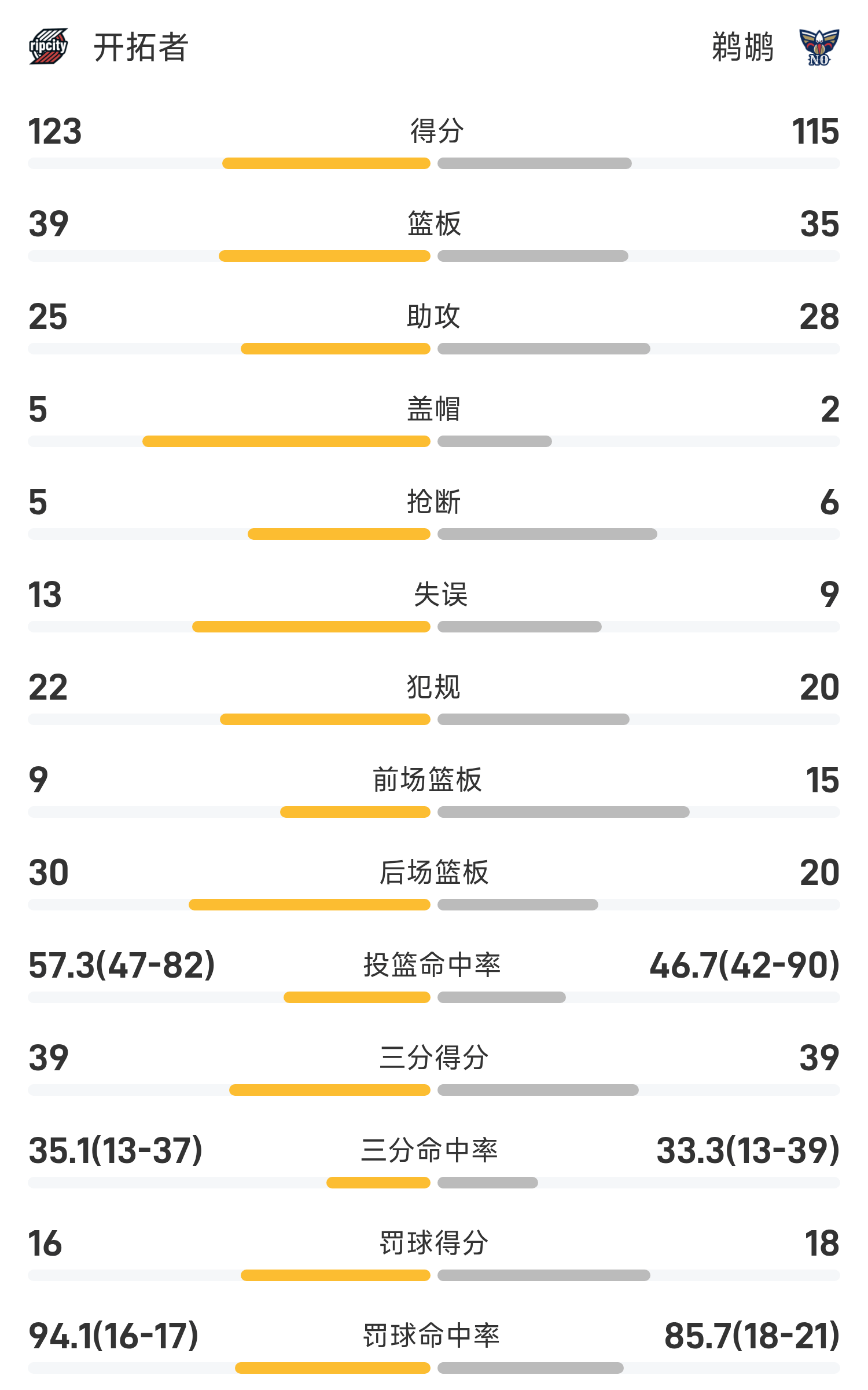 6686体育官网11月13日讯 25/26赛季NBA 常规赛,鹈鹕对阵开拓者。双方全场战罢,鹈鹕117-125不敌开拓者。夏普砍下全场最高的35分5板3助,率领开拓者胜利取胜。