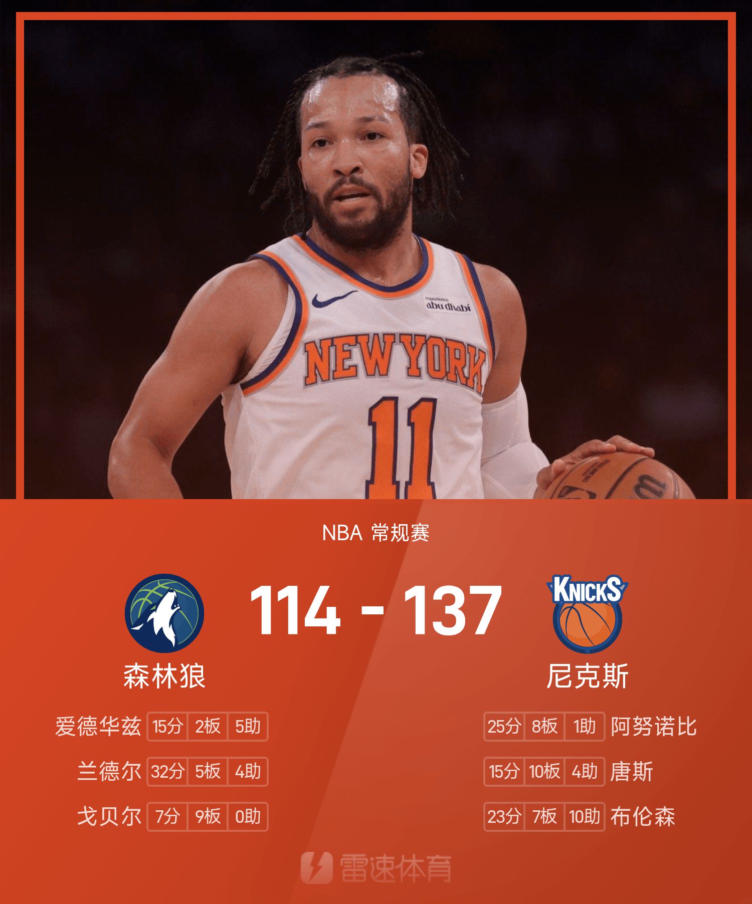 双方全场战罢,尼克斯137-114战胜森林狼。