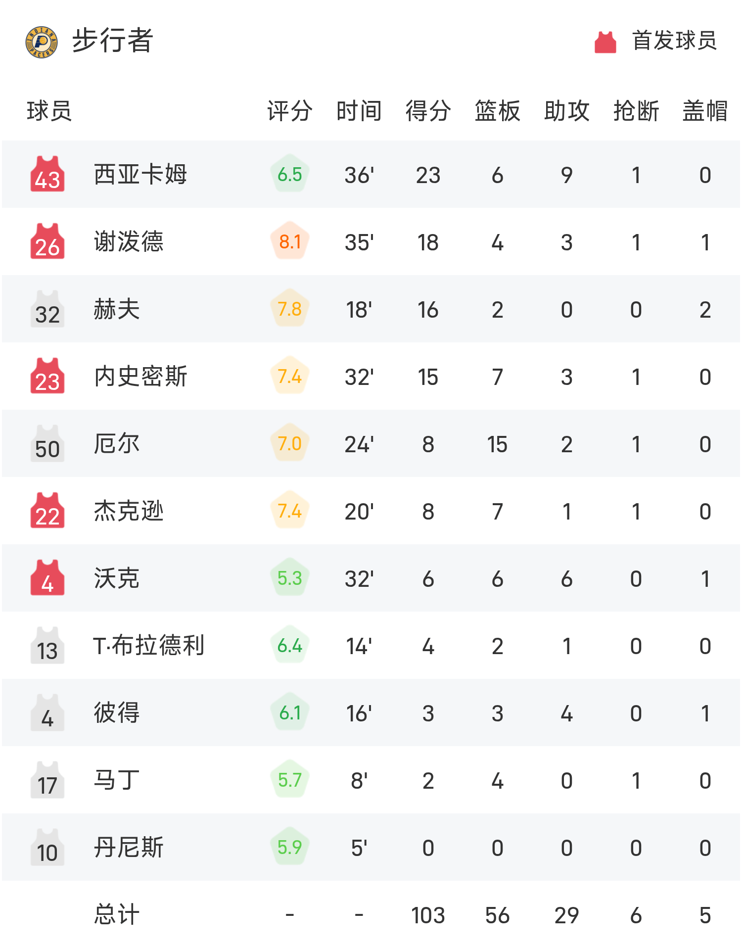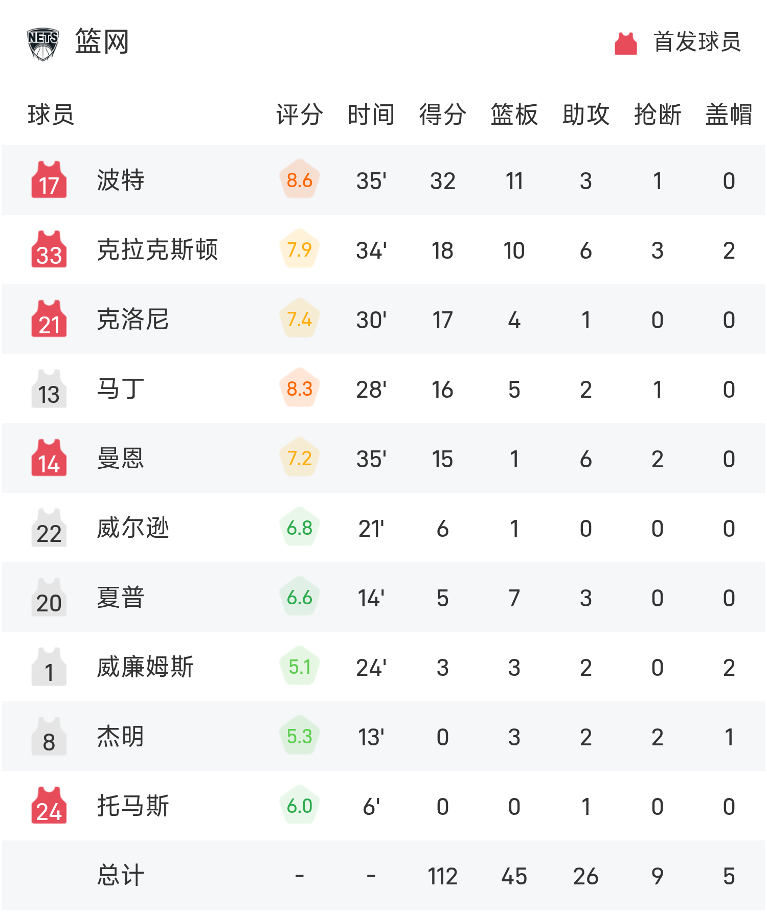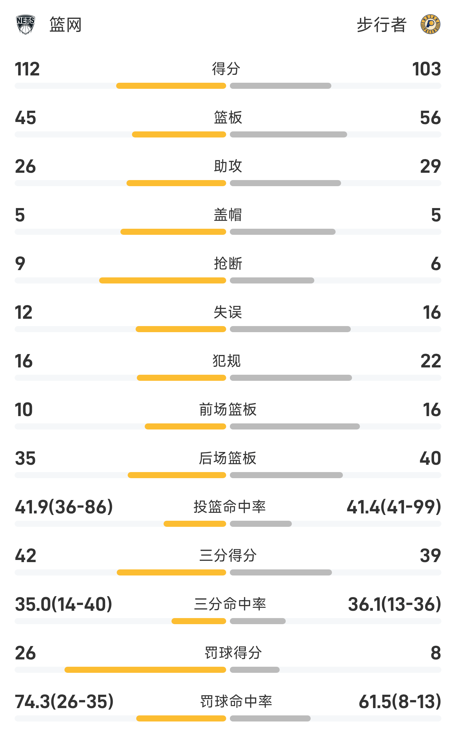 6686体育官网11月06日讯 25/26赛季NBA 常规赛,步行者对阵篮网。双方全场战罢,步行者103-112不敌篮网。波特砍下全场最高的32分10板2助,率领篮网胜利取胜。