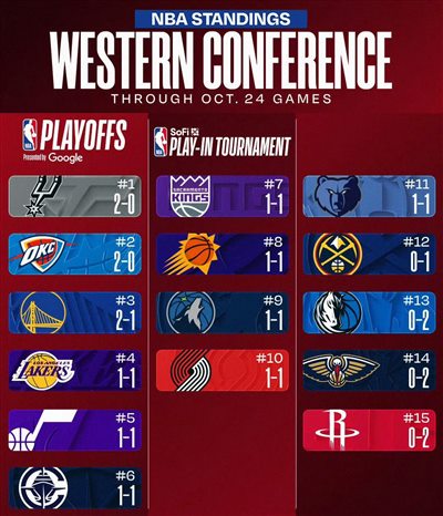 目前新赛季前两场竞赛战罢,火箭、独行侠与鹈鹕均一胜难求,并列西部倒数第一,而马刺与卫冕冠军雷霆则以2胜0负的战绩领跑西部。
