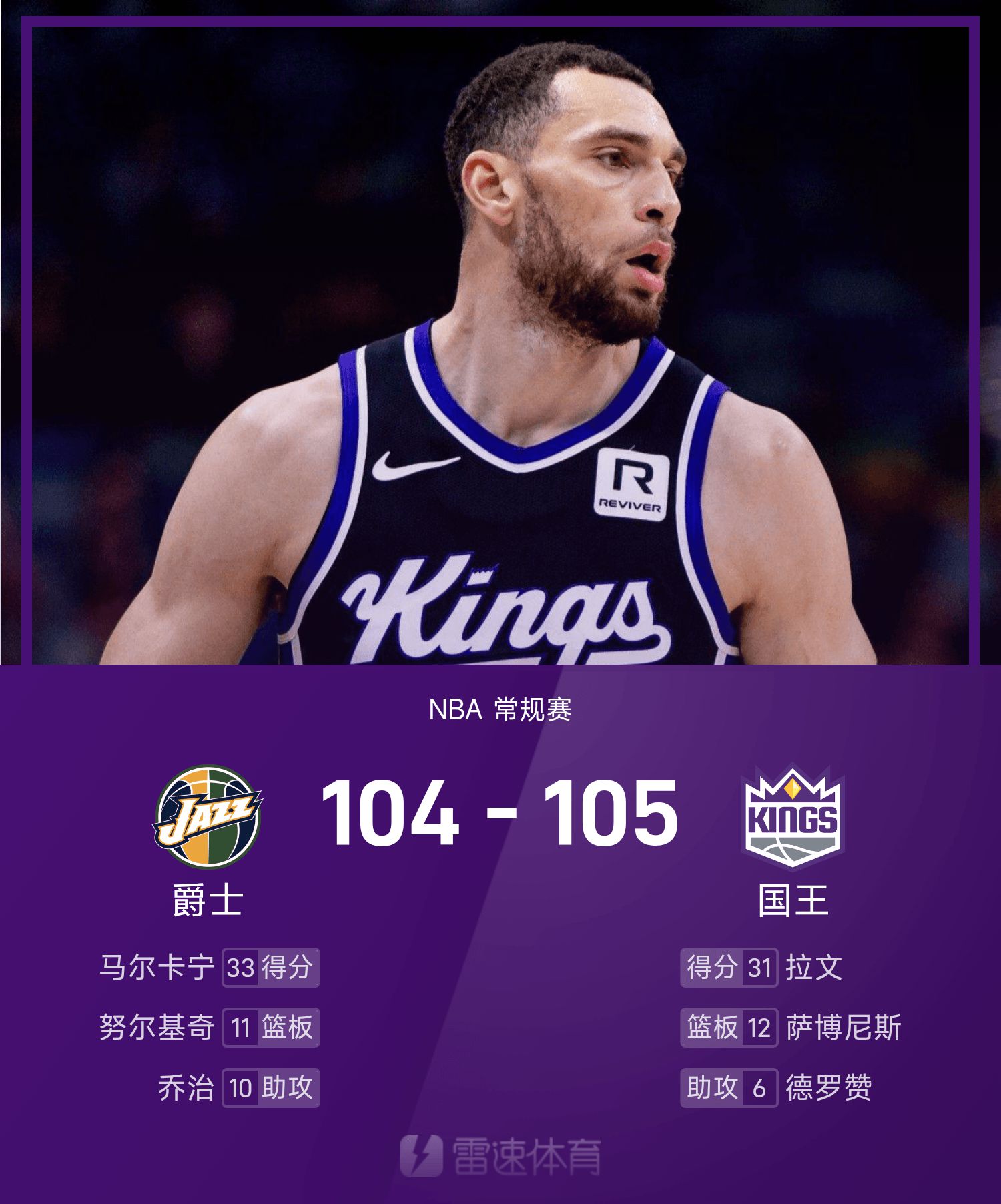 NBA战报:拉文31分,国王105-104险胜爵士