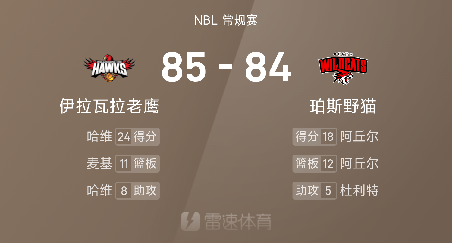 6686体育官网10月25日讯 25/26赛季NBL 常规赛,珀斯野猫对阵伊拉瓦拉老鹰。双方全场战罢,珀斯野猫84-85不敌伊拉瓦拉老鹰。哈维砍下全场最高的24分5板8助,率领伊拉瓦拉老鹰胜利取胜。