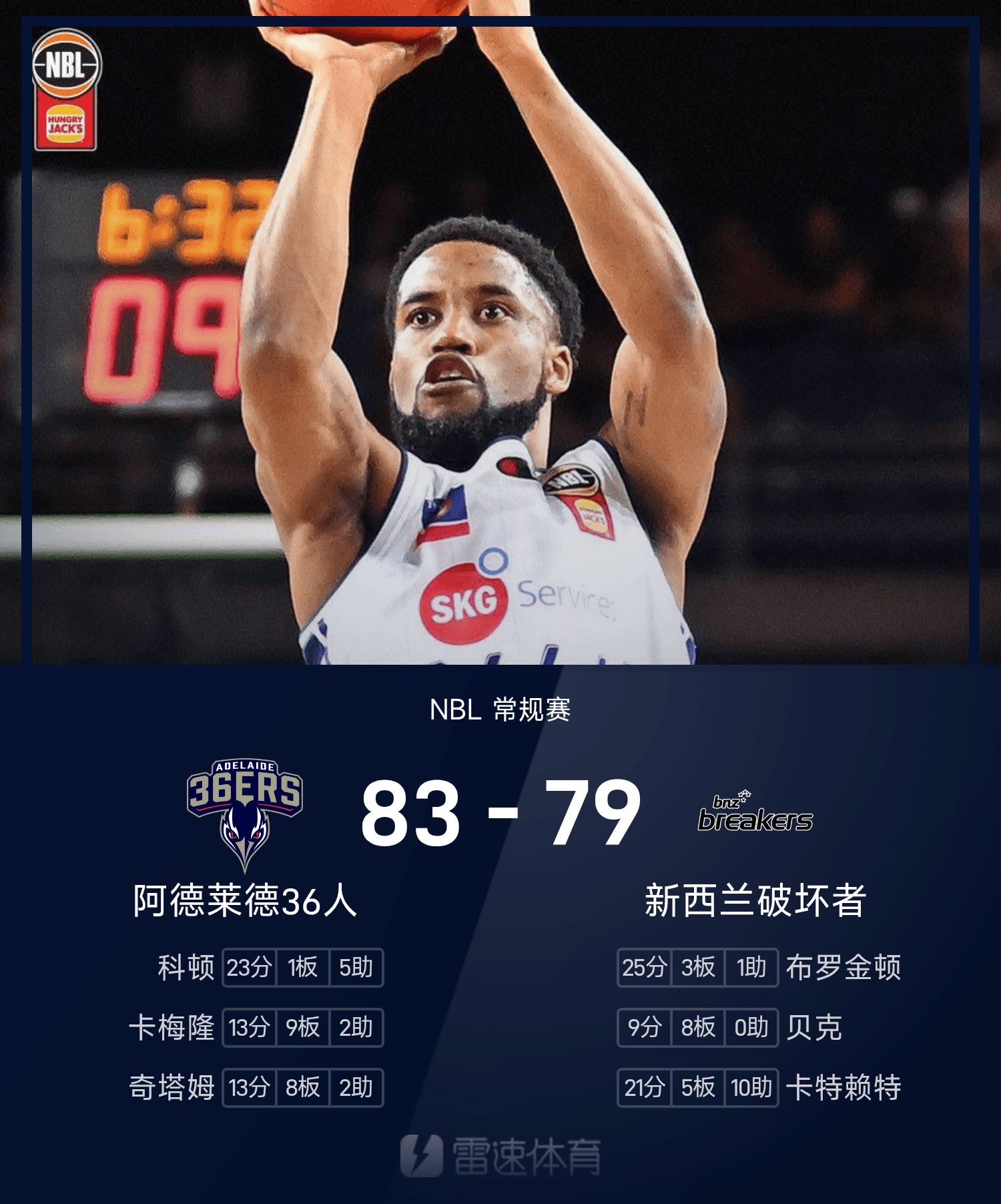 NBL战报:科顿23分,阿德莱德36人83-79险胜新西兰毁坏者