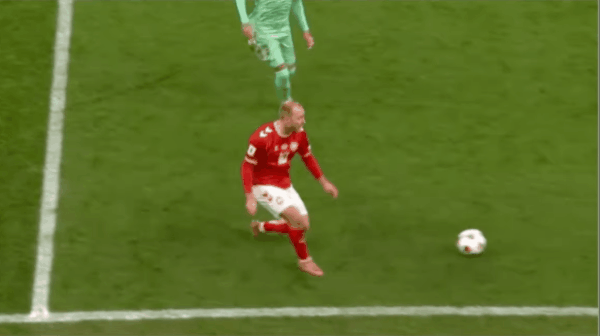 4’埃里克森主罚自由球直接打门,皮球被白俄罗斯人墙挡出