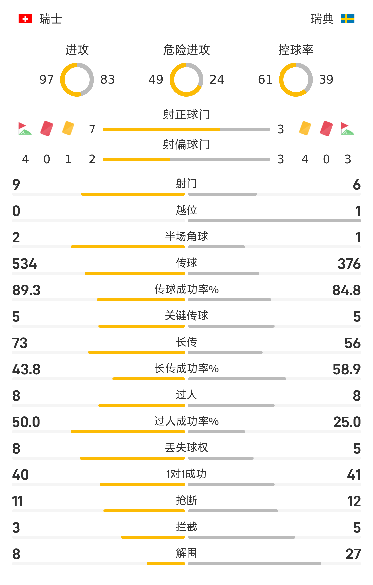 瑞典首发阵容:12-约翰逊、4-希恩、6-霍尔姆(50’5-古德蒙德森)、2-拉格比尔克、8-斯文松、16-卡尔斯特罗姆、21-伯恩哈德森(78’17-利德博格)、18-阿亚里(63’22-泽内利)、11-埃兰加(78’10-福斯贝里)、19-斯万贝里(62’9-伊萨克)、7-尼格伦