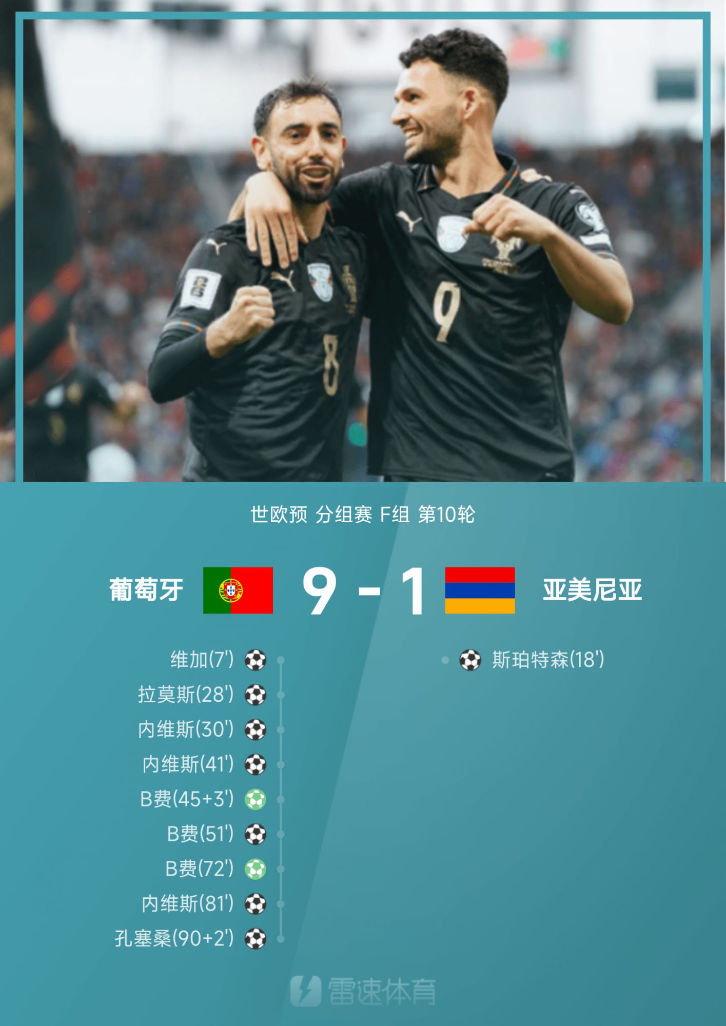 6686体育官网11月16日讯 26赛季世欧预分组赛F组第10轮,葡萄牙主队场以9-1狂胜亚美尼亚。维加为葡萄牙闪击,随后斯珀特森为亚美尼亚扳平局赛果分;接下来的竞赛里,葡萄牙队有如神助,内维斯和B费相继完成帽子戏法,拉莫斯送出传射,孔塞桑为球队锦上添花。葡萄牙以4胜1平1负积13分,斩获F组第一,直接获得2026美加墨世杯赛的入场券。