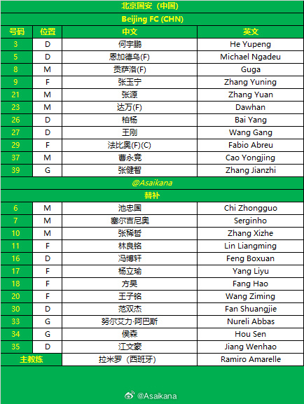 北京国安首发:39-张健智、3-何宇鹏、5-恩加德乌、26-柏杨、27-王刚、8-古加、21-张源、23-达万、37-曹永竞、9-张玉宁、29-法比奥