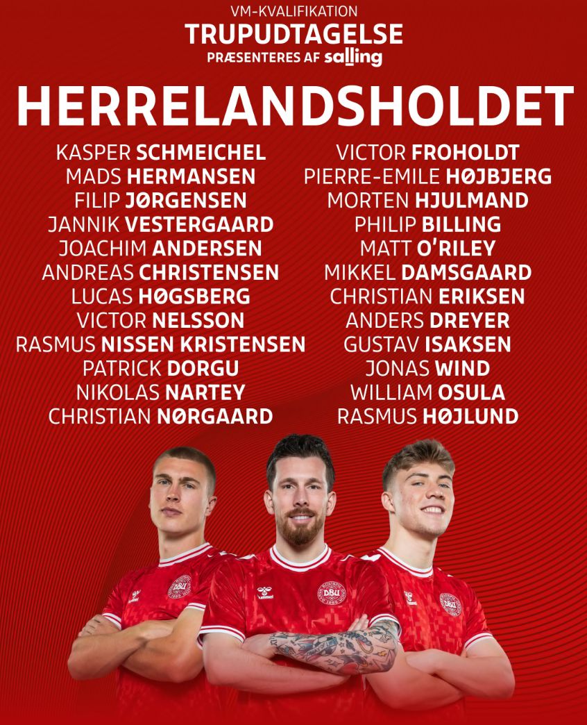 6686体育官网11月6日讯 11月份的国际竞赛日,丹麦将迎来两场世杯赛欧洲区资格赛,分别对阵白俄罗斯和苏格兰。今天丹麦队官方公布了新一期的国家队大名单,其中霍伊伦领衔锋线,中场埃里克森入选。